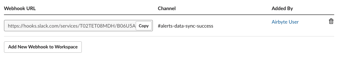 1. Select the channel that you want to receive Airbyte notifications in (ideally a dedicated one), and click Allow to give it permissions to access the channel. You should see the bot show up in the selected channel now. You will see an active webhook right above the Add New Webhook to Workspace button.